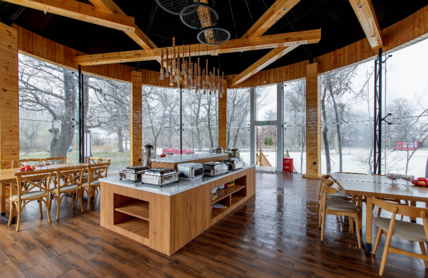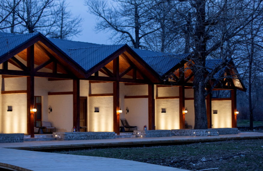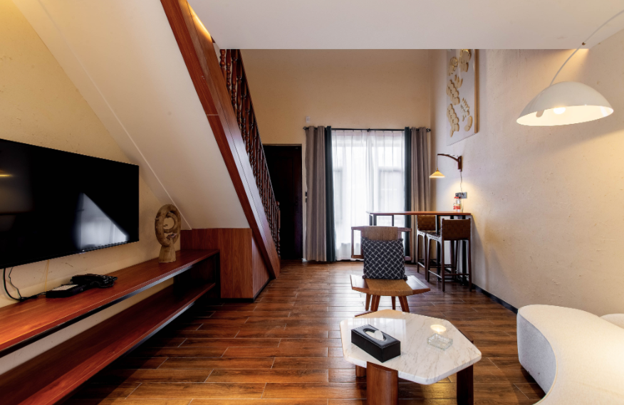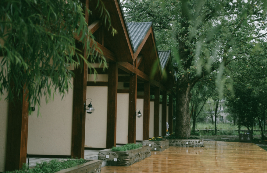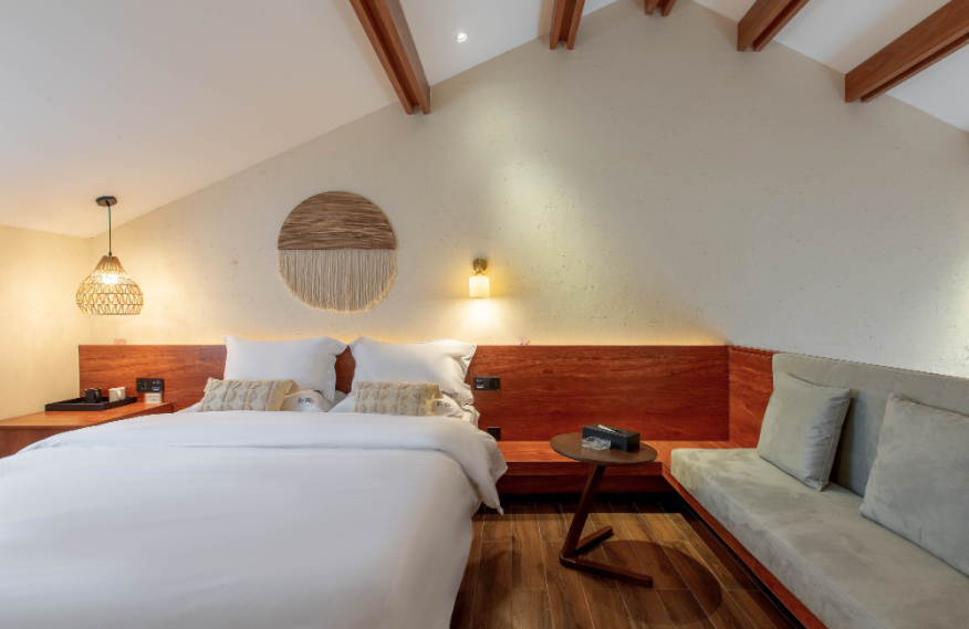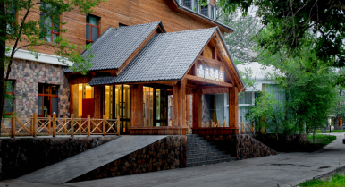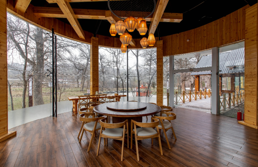 占地面積80畝,坐落于森林里,采用木屋、石頭、玻璃等主材建造,立志打造“在自然里長(cháng)出的建筑”,室內室外一步一景。 酒店一期客房數量55間,其中普通標準間32間,大床房10間,家庭房2間,庭院房11間,餐廳面積300㎡,客房具有面積大,空間視野好的特點(diǎn),按照準五星級生態(tài)園林酒店的標準配備高檔、精致家具及潔具,裝飾裝潢強調統一中顯個(gè)性,力求舒適、溫馨、實(shí)用。