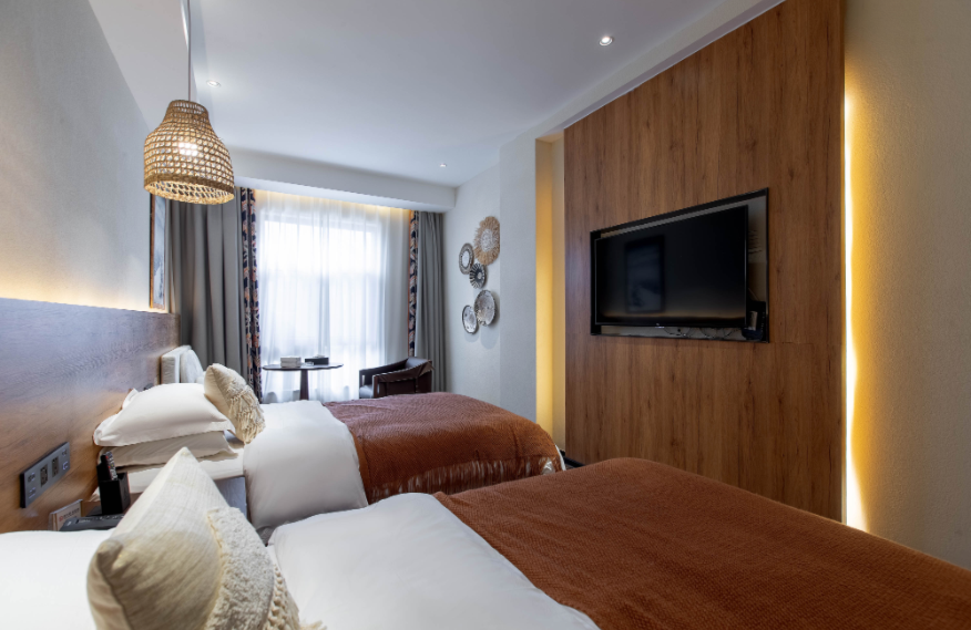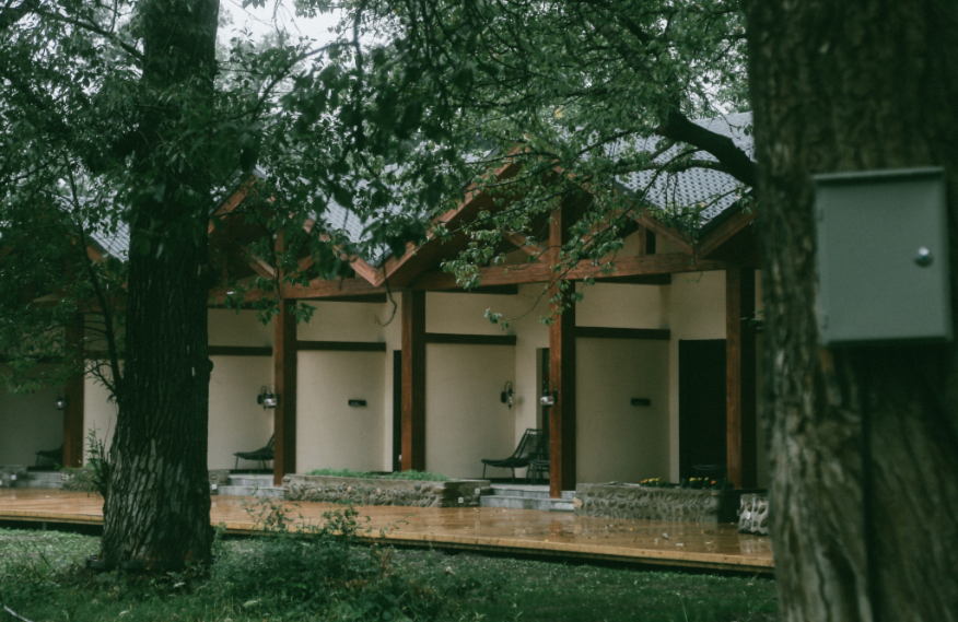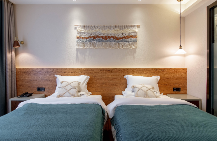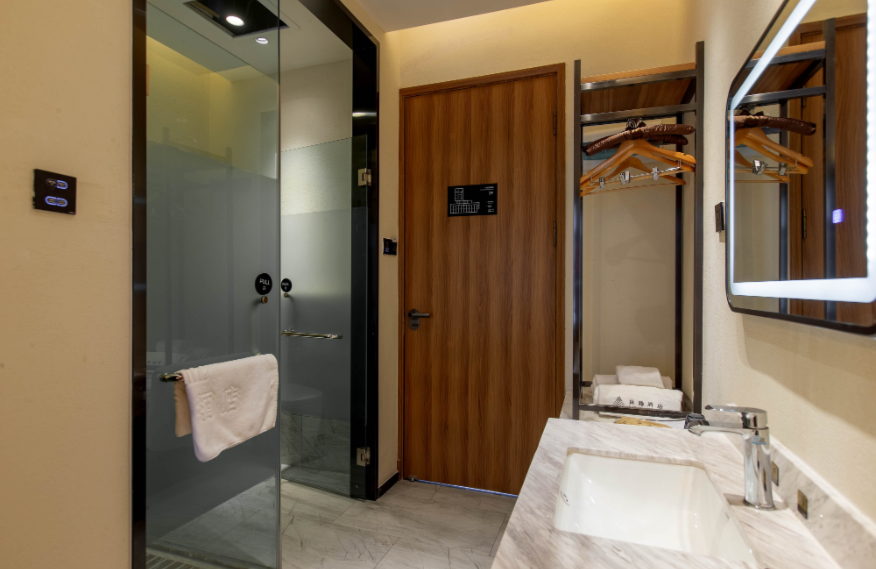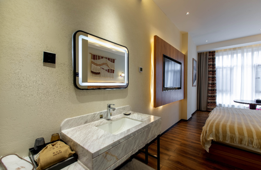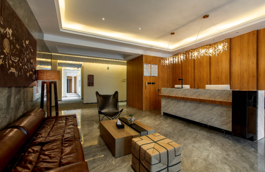 占地面積80畝,坐落于森林里,采用木屋、石頭、玻璃等主材建造,立志打造“在自然里長(cháng)出的建筑”,室內室外一步一景。 酒店一期客房數量55間,其中普通標準間32間,大床房10間,家庭房2間,庭院房11間,餐廳面積300㎡,客房具有面積大,空間視野好的特點(diǎn),按照準五星級生態(tài)園林酒店的標準配備高檔、精致家具及潔具,裝飾裝潢強調統一中顯個(gè)性,力求舒適、溫馨、實(shí)用。